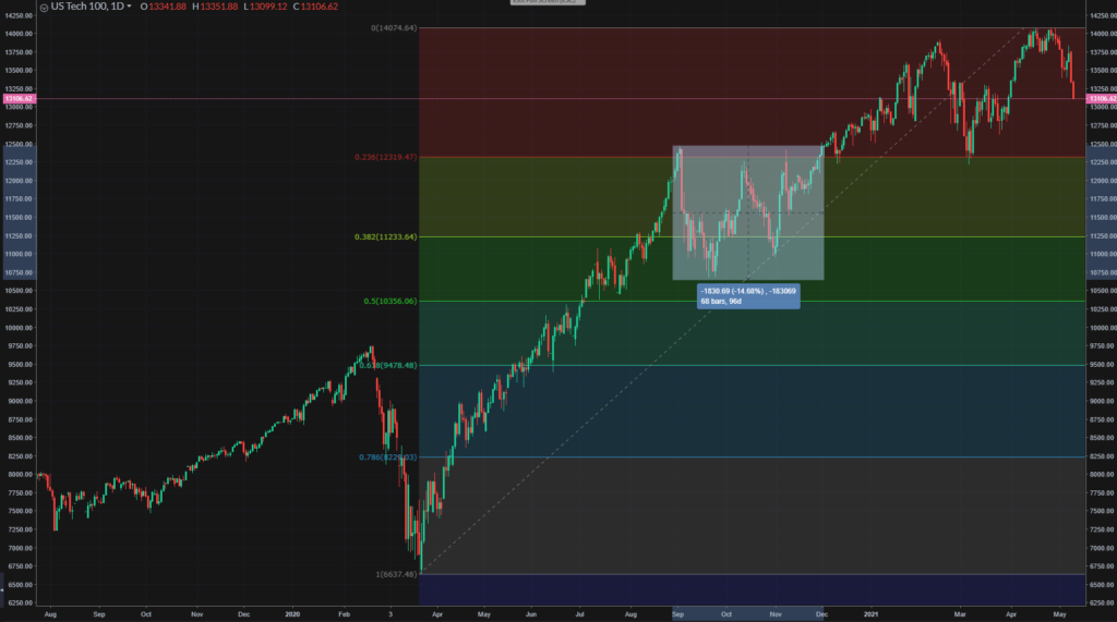 It’s a bit indiscriminate – lots of the big reflation plays off heavily which suggests this is a ‘sell everything’ kind of day (which could be why bonds are not moving as impetus to buy and drive yields down is offsetting the inflation stimulus to sell and drive yields up). This seems very similar to the sort of tech bleed we saw last September when we thought the macro picture was understood and tech looked a little overbought, whilst broader markets were not so much since it was well before the big Nov rotation began. If similar to that period then we might expect a similar 10-15% move off the all-time highs back to the March lows around 12,200, and it could take three months to regain. That is assuming there are not deeper problems ahead – a Fed taper tantrum is still ahead.