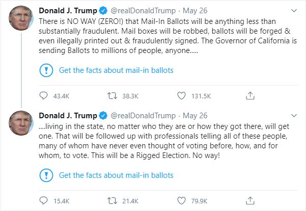 A few days ago Trump posted a tweet which contained several claims about postal ballots. Many states are expanding their postal balloting because of concerns that in-person voting could lead to a spike in Covid-19 infections.