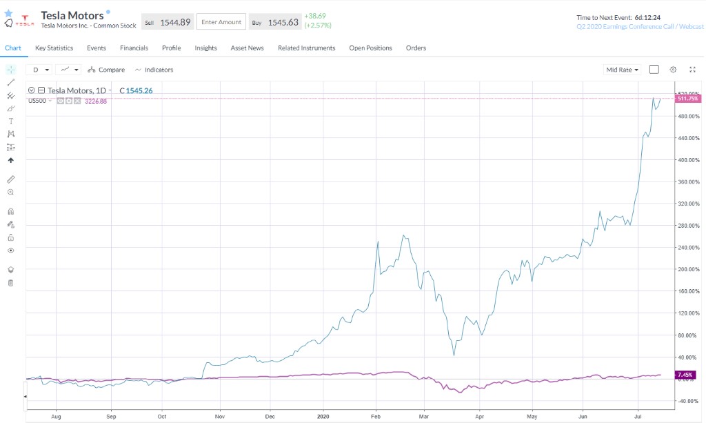 Tesla (TSLA) has enjoyed a stunning rally in 2020, rising 270% year to date. In the last 12 months, the stock has risen more than 500% in what can only be described as one of the most amazing turnarounds in corporate history. Over this period the S&P 500 has gained around 7%. Valuations are out the window and the stock is trading on tech multiples – some would say for good reason, but short interest in the stock – the percentage of shares out on loan to traders betting the stock will fall – remains relatively high at 7.5%.
